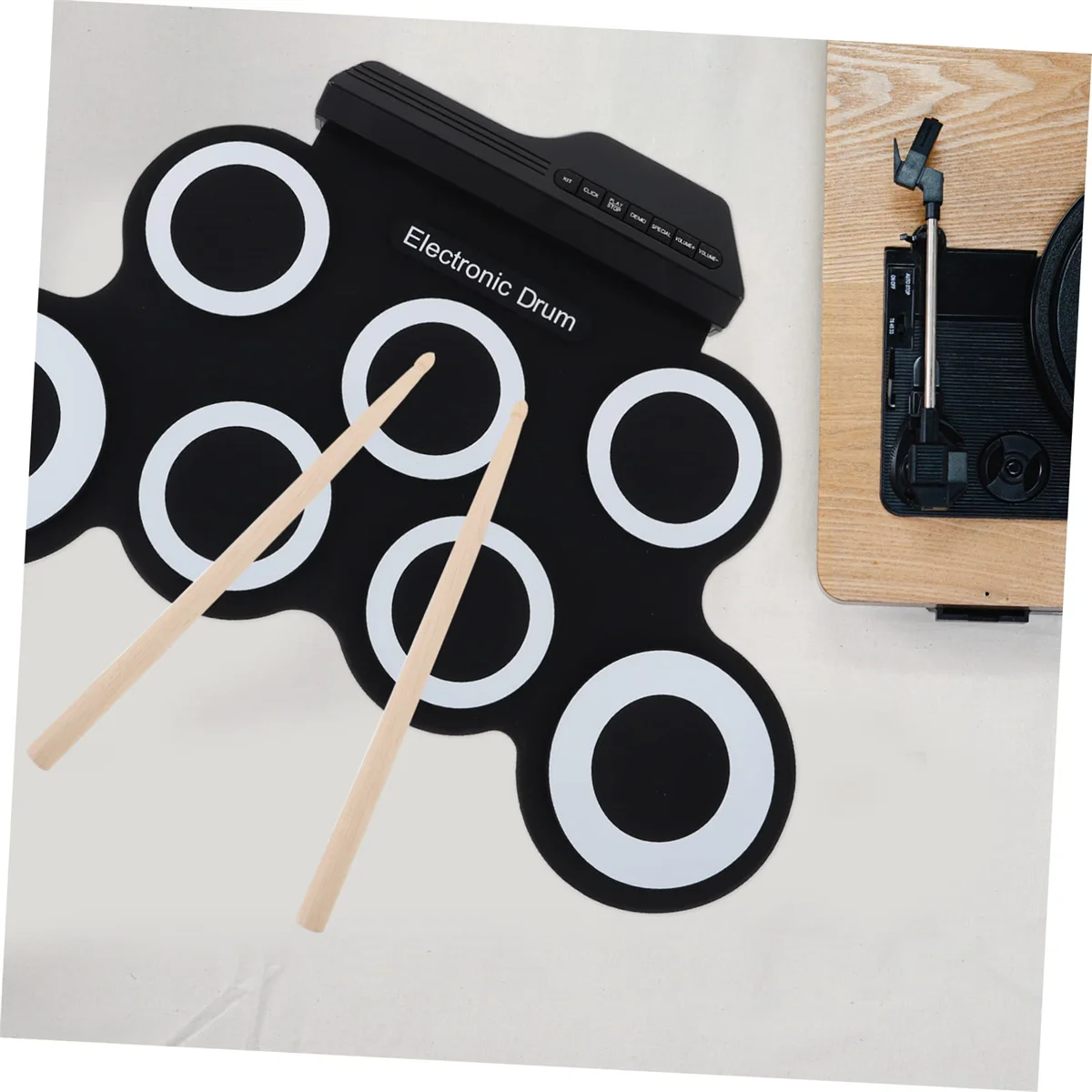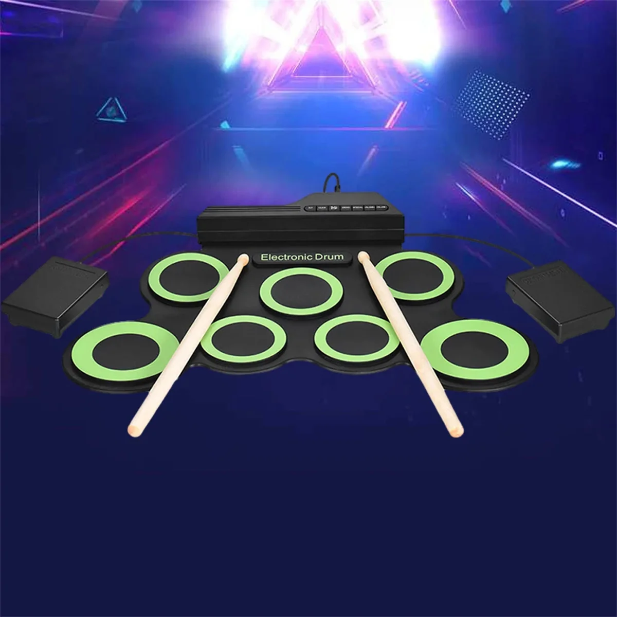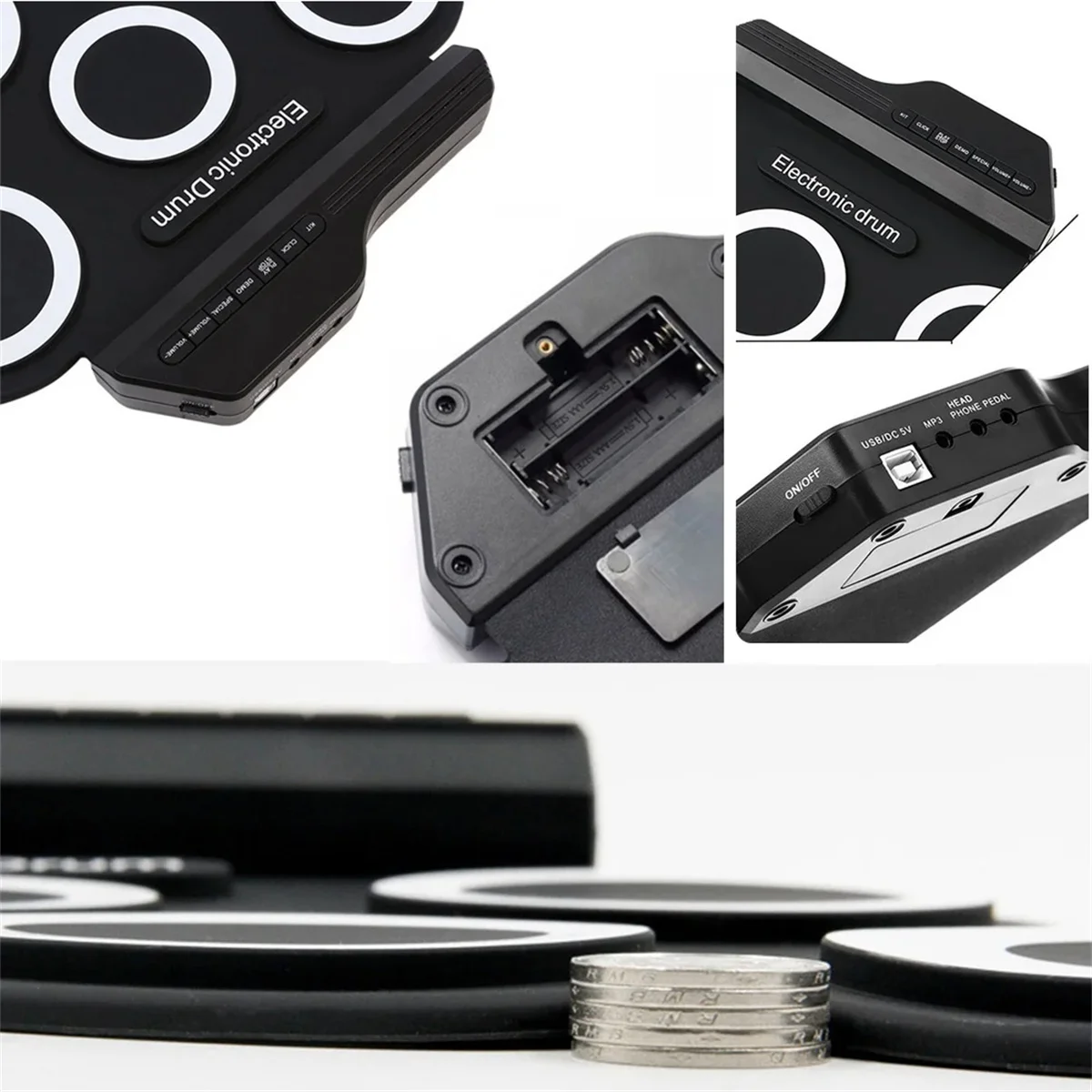 Nuevo kit de batería electrónica portátil de silicona plegable con rollo de mano y USB, con baquetas y pedal de sustain.
