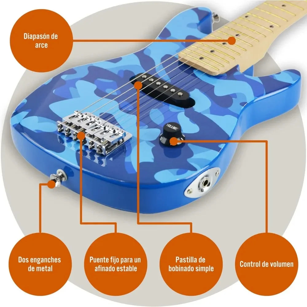 - DISEÑADA PARA PEQUEÑAS ESTRELLAS DEL ROCK: Esta guitarra, específicamente diseñada para niños de 4 a 8 años, posee un cuerpo ergonómico y ligero en un exclusivo color azul camuflaje desarrollado para que a los más pequeños les resulte cómodo sostenerla y tocarla. Su diapasón liso de arce y su altura de cuerdas baja hace que pulsarlas resulte sencillo. El amplificador de 5 W también incluye una correa para que los pequeños guitarristas puedan moverse mientras tocan