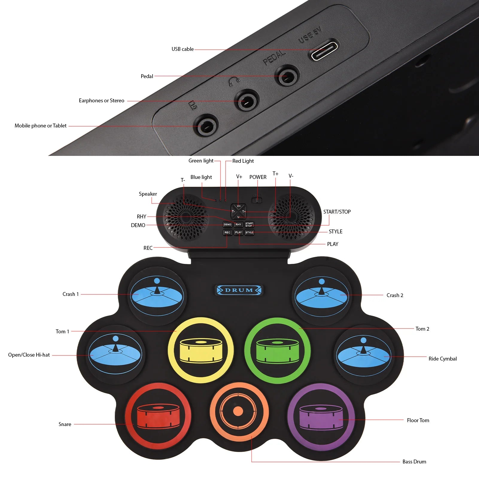 1. 【Portable Drum Pad Kit】: This drum set is designed to be portable and convenient, allowing you to practice and play drums anytime and anywhere. With its compact size and lightweight design, it is perfect for musicians on the go.2. 【Versatile Functions】: Featuring 9 drum pads, 7 different drum styles, and 6 rhythms, this electric drum set offers a wide range of options for creating your own unique beats. It also includes 10 demo songs for inspiration and recording capabilities for up to 800 beats.